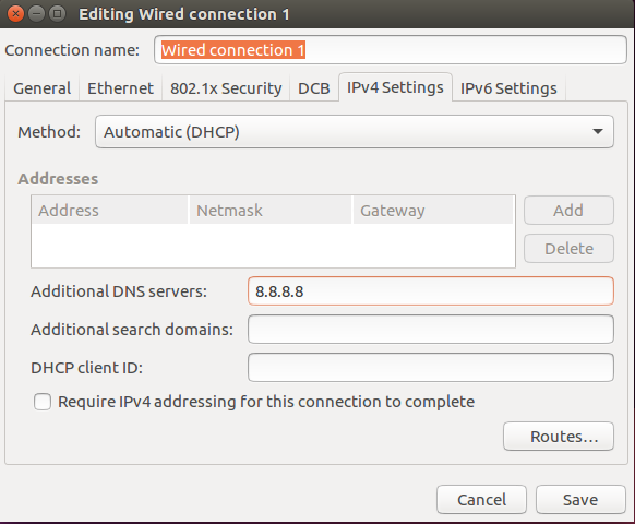 Don't forget to setup your network properly before continuing any further. If you are using DHCP on a virtual machine you should be fine. If you need to setup statically, make sure to do so and test your internet connection before proceeding. Pinging 8.8.8.8 and google.com from terminal will confirm that everything is working as intended. If you cannot ping google.com, make sure you edit your connections by clicking the connection in the top right section of your machine and using the drop down, select edit connections. Then select your connection of choice and click edit. After this add 8.8.8.8 or your DNS of choice to the additional DNS servers section. Then save and try again. This is one of the most common issues I see from others setting up their Ubuntu environment.