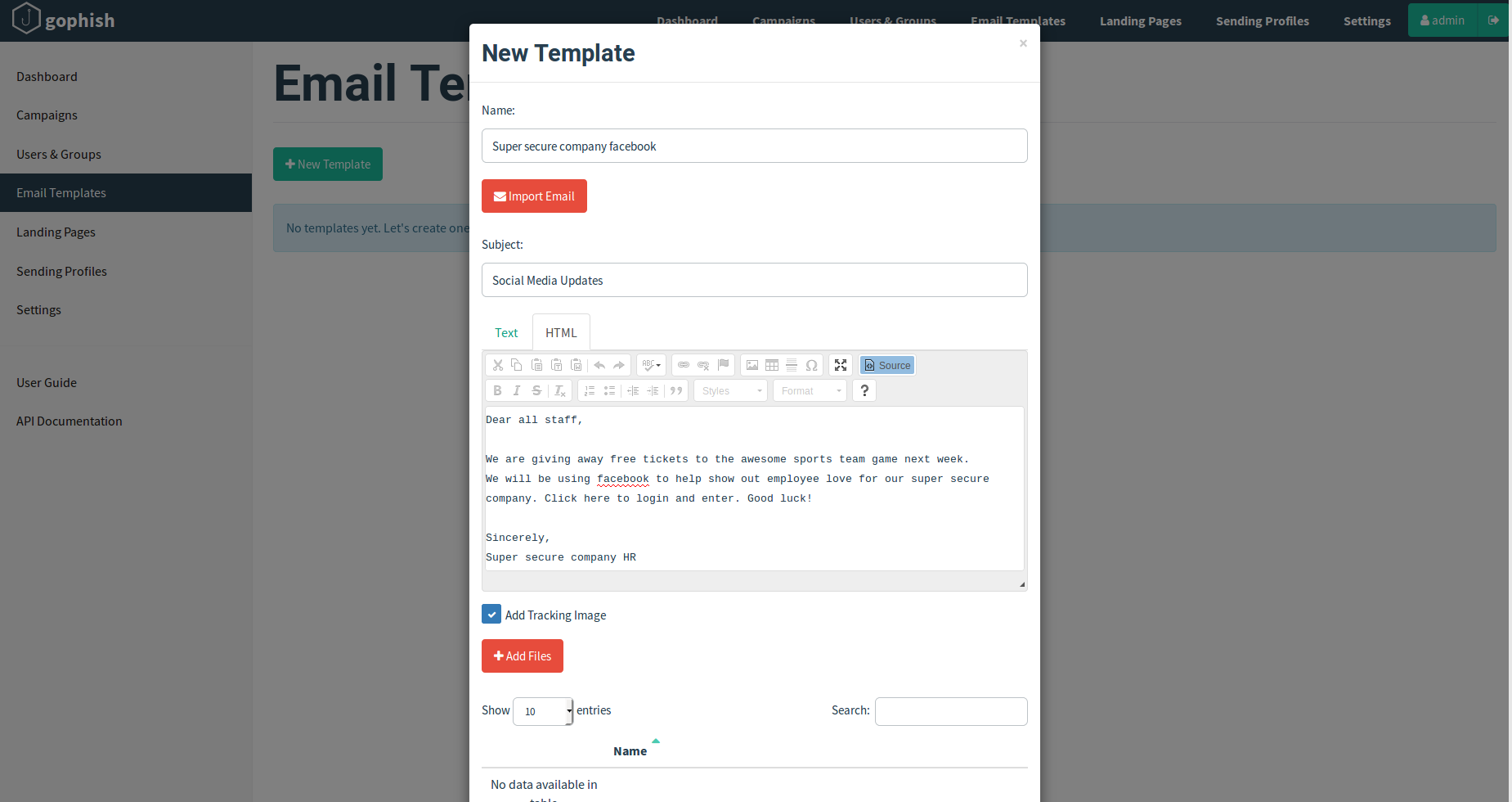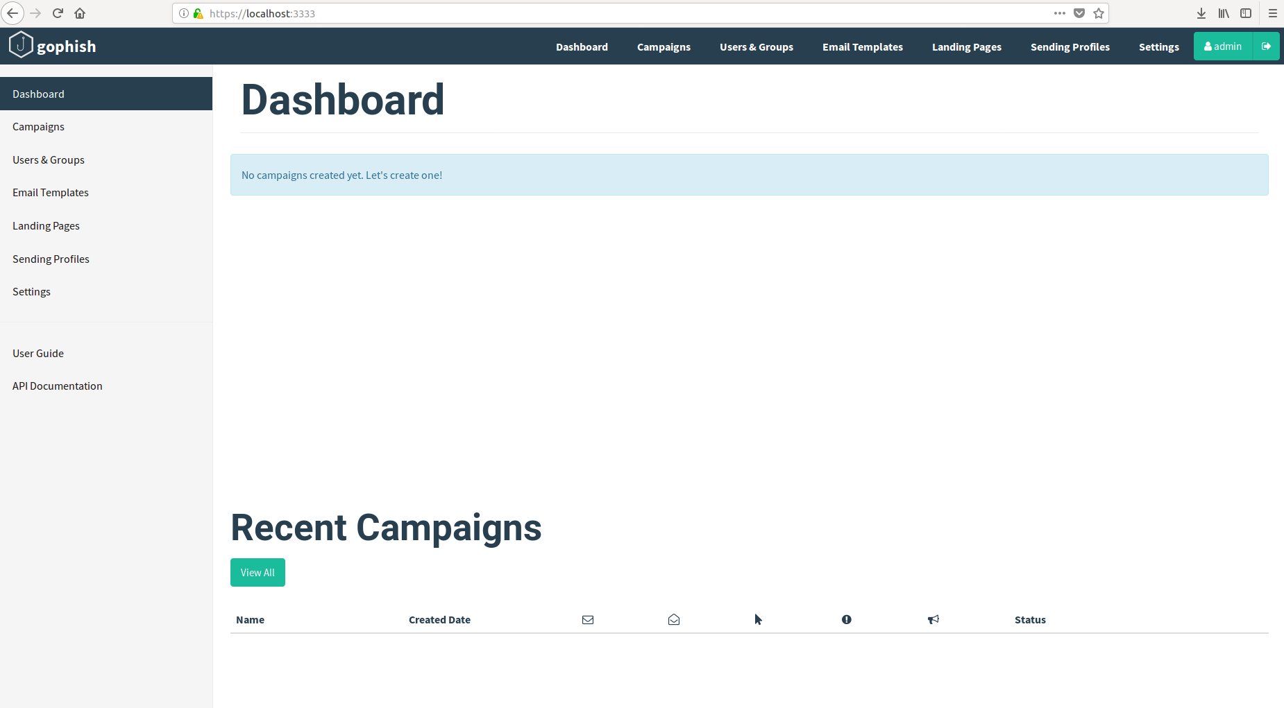 Once running, navigate to https://localhost:3333 and login to your new phishing environment. (Default credentials are admin/gophish)