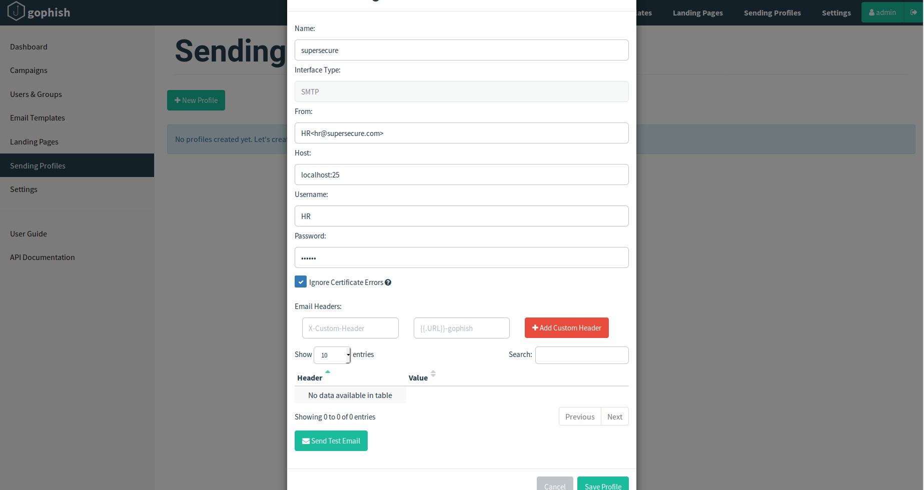 Once you have done this, put the from section of the sending profile to how you would like it to appear, set your host to localhost:25, username to the username created (HR in our example) and put in the password for the account. This will allow GoPhish to send out the messages from the account you created.