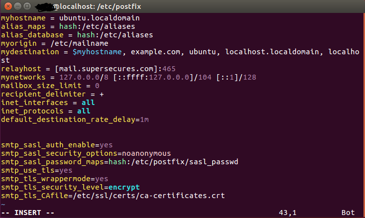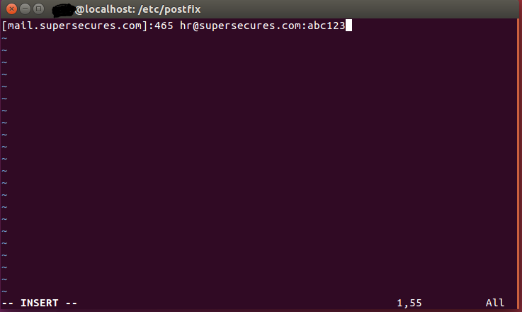 sudo vim /etc/postfix/sasl_passwdThis is where some knowledge about your domain will come in handy. for hostgator, the port for mail is 465 so make sure you do your homework and add the proper information this section as it will allow the connection between postfix and your host. You will be replacing the domain with your domain name, the email address with the one you created, and after the ":" you will put your password. After this, save the file and you are one step closer.