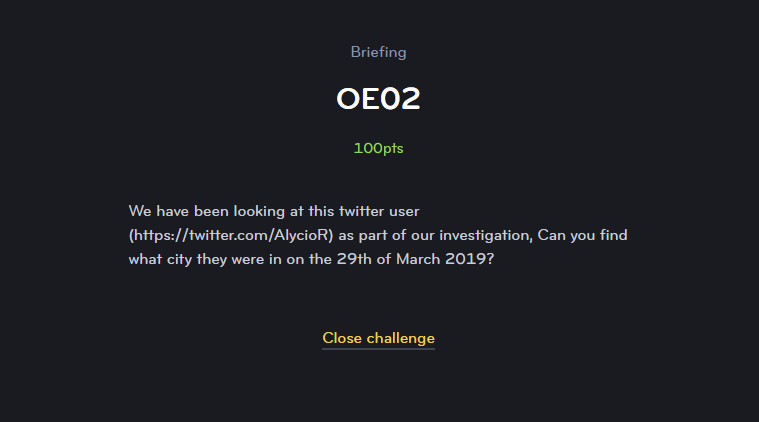The Challenge here was to track down the location used in a twitter account and submit it as a flag. There was no special formatting and a direct link to the account was provided.