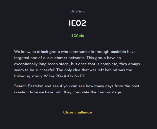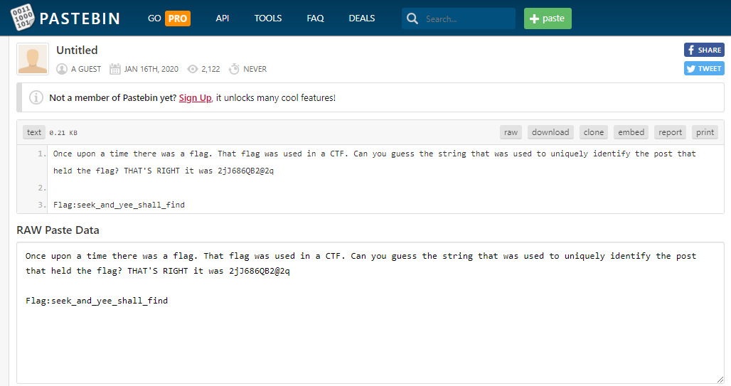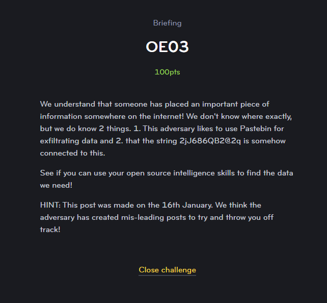 Well that seems straightforward. In place of a full flag, this time the goal is to find some information posted in the content. A search on Pastebin again leads to this page: