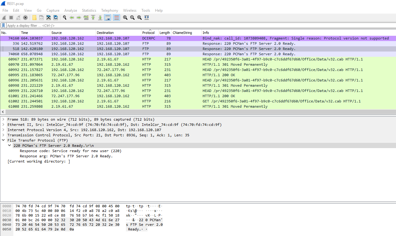 Since the goal is to find a vulnerable service, sorting by protocol seems like a logical first step. This yielded some FTP packets right at the start. Let’s dig a little deeper.