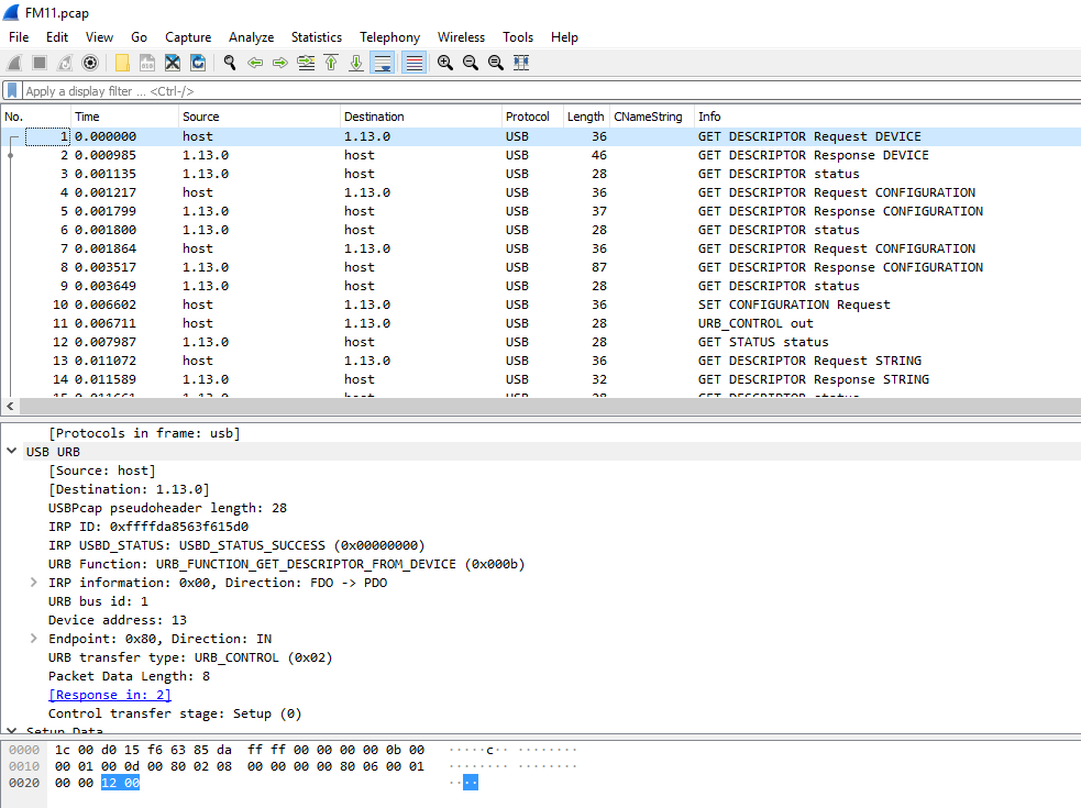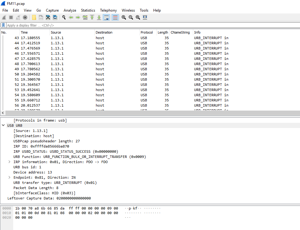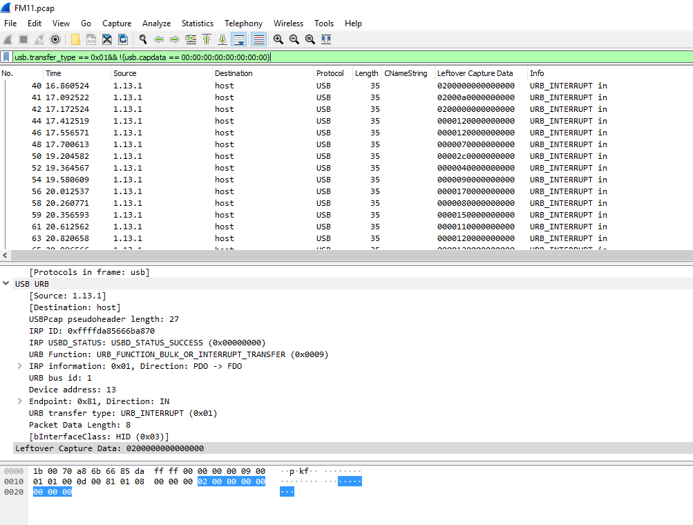 Excellent, there is even a section with a label, leftover capture data. Very interesting. Adding some filters usb.transfer_type == 0x01&& !(usb.capdata == 00:00:00:00:00:00:00:00) should make that data easier to track down.