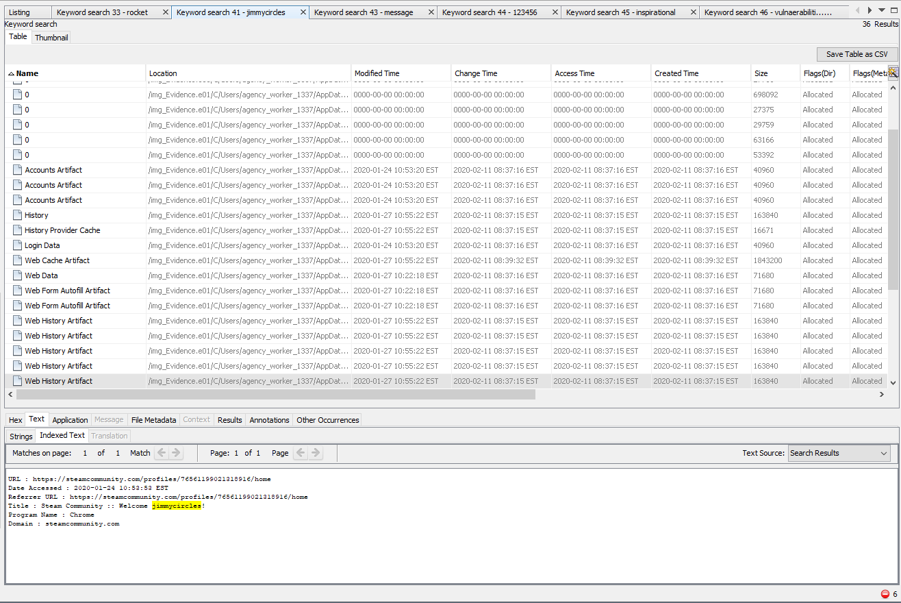 I will admit, this one stumped me for a while. Autopsy is pretty easy to use and I was swimming in steam information for the account on the image. However, I kept looking for an identifier of 3 to find the proper account. Some further research led to the fact that Steam can have IDs listed the way I generally see, the profile ID, SteamID3 and SteamID64. So digging into the image I recovered the Steam account name, Jimmycirles01 first.