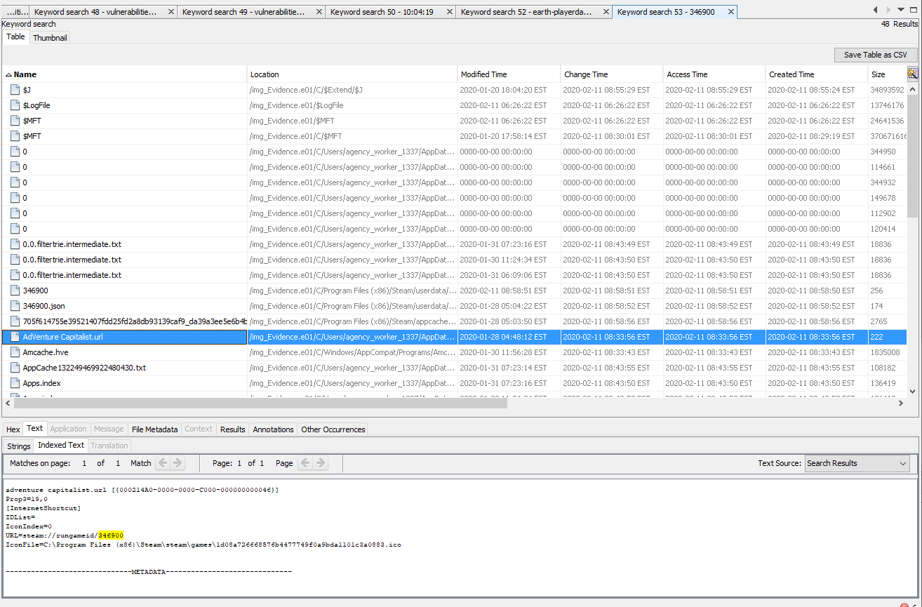 With the account name in hand, a quick search in Autopsy found quite a few files containing the name. One of the files (several to be honest) had the Steam account profile ID in the URL as well. Jackpot.