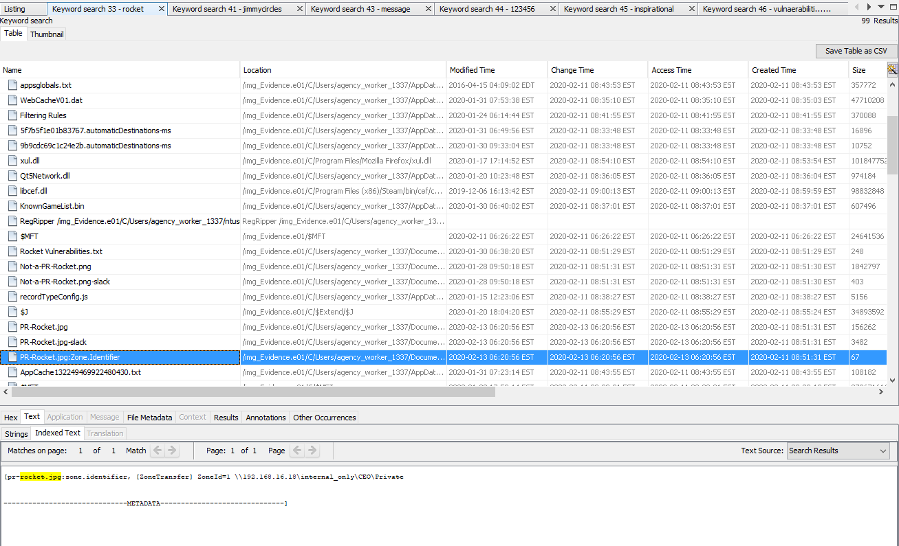 The first step in solving this was to do a keyword search in Autopsy for the exact time listed by the challenge. This gave exactly the results I was looking for.