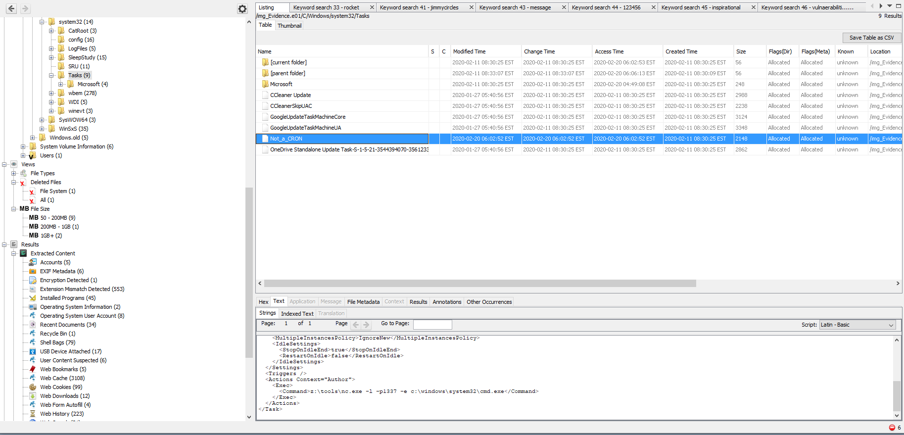 A little bit of research revealed that the tasks should be stored in a pretty specific directory (C/windows/system32/tasks). That sounds like a promising start. Searching this directory revealed a file named Not_a_Cron. Well, that may be a big hint.