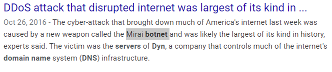 Well, that should be easy. A quick Google search or keeping up with the news gives the answer Mirai botnet.