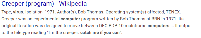 Again, some quick Google skills or knowledge and you will find the Creeper virus.