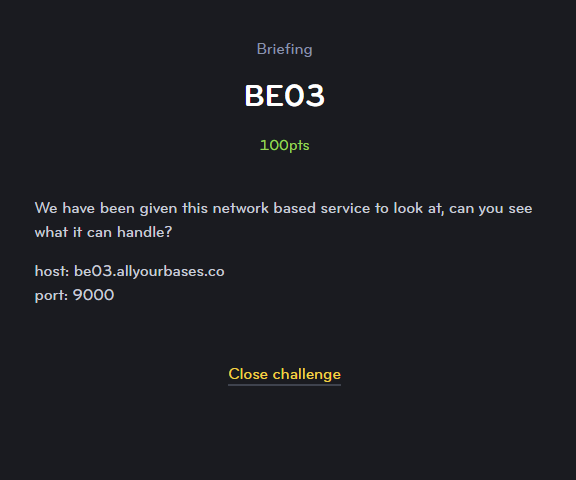 This challenge was pretty straightforward in that the task was to obtain a flag through an address and port.