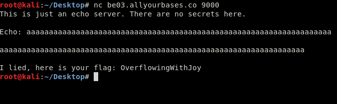 I was lied to! There is the flag from the overflow, OverflowingWithJoy, and a quick few points.