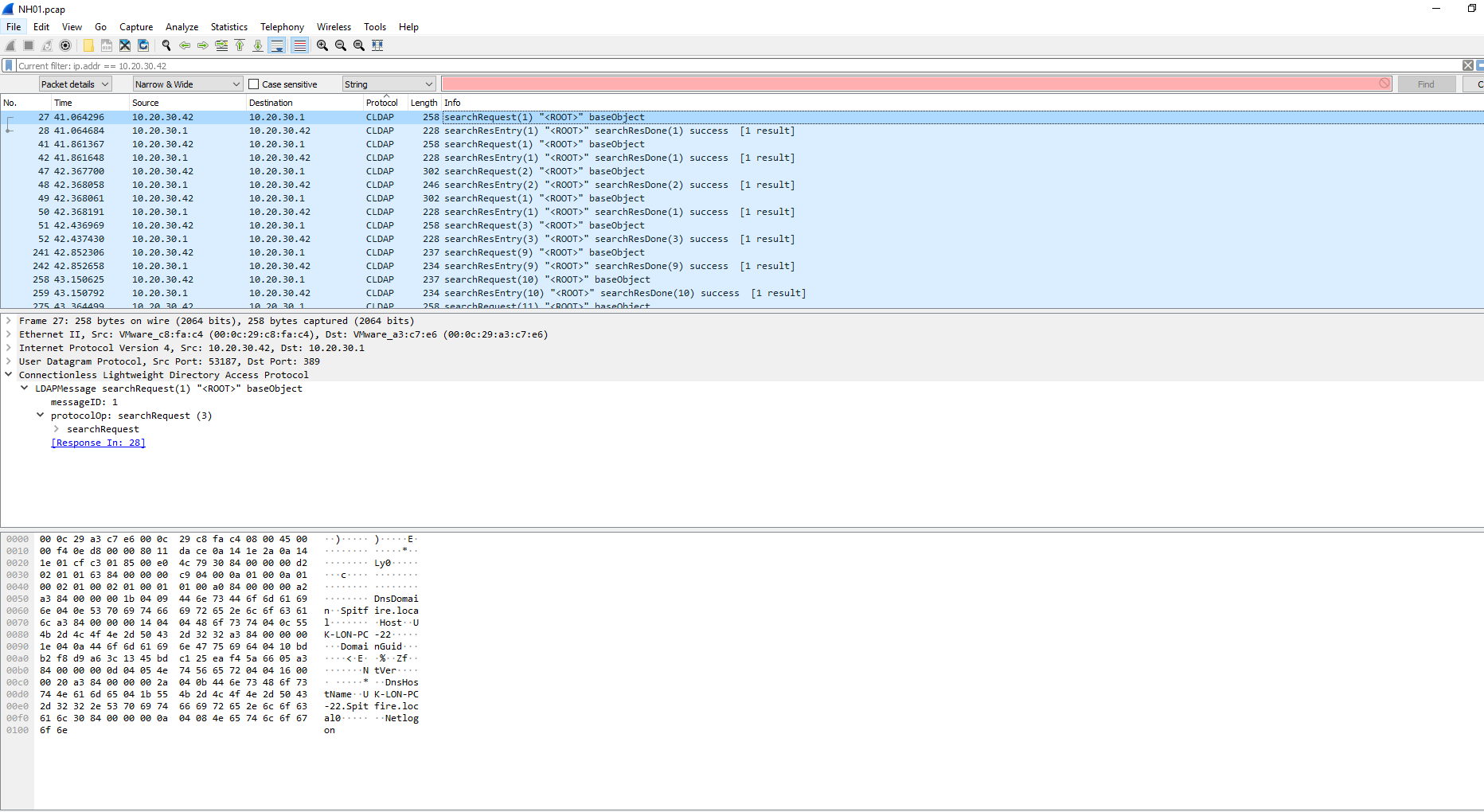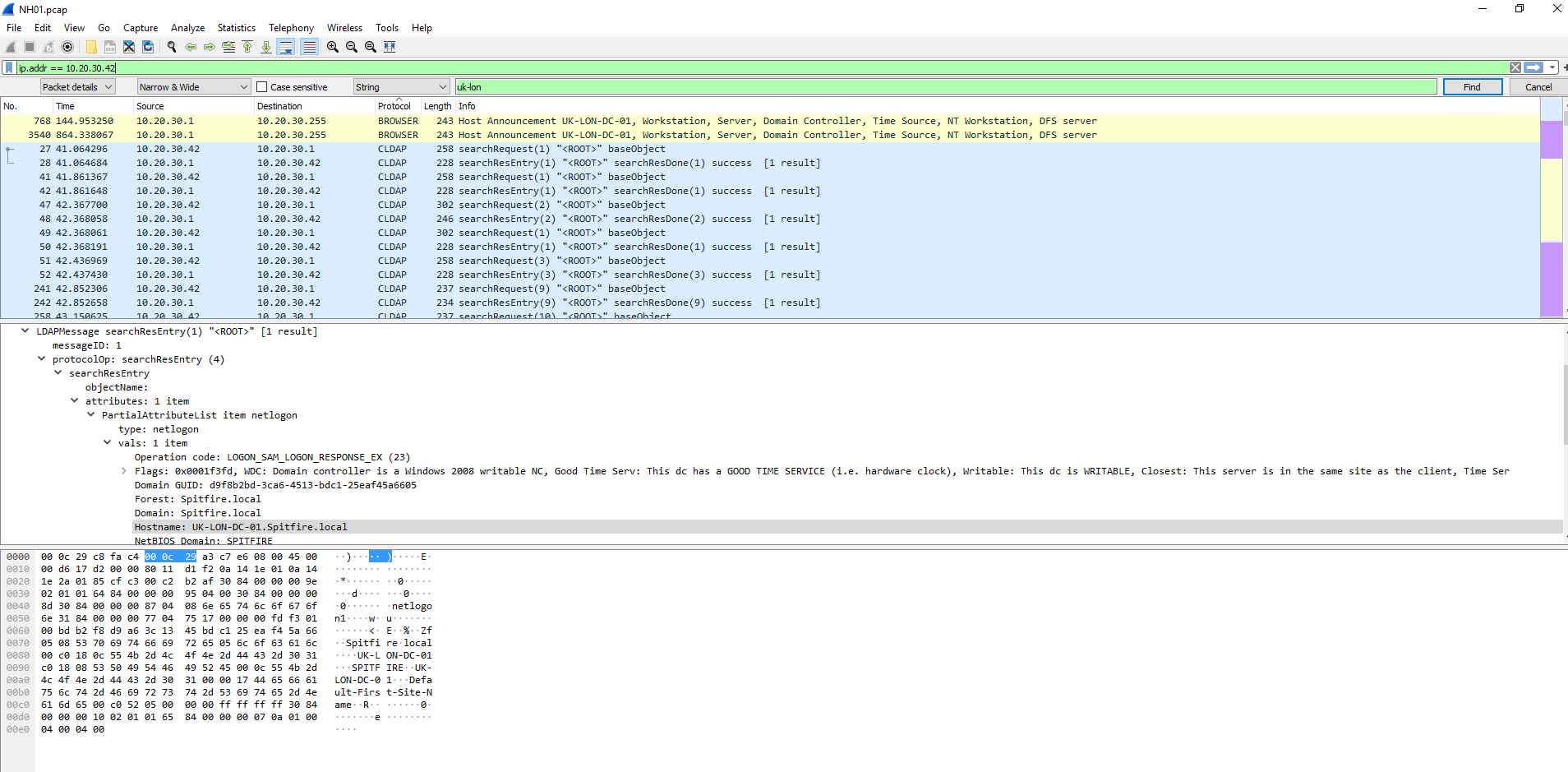 With the name used as a search string in the packet details, the host was easy to find. Now I decided to add an IP filter to look only for the workstation within this PCAP.