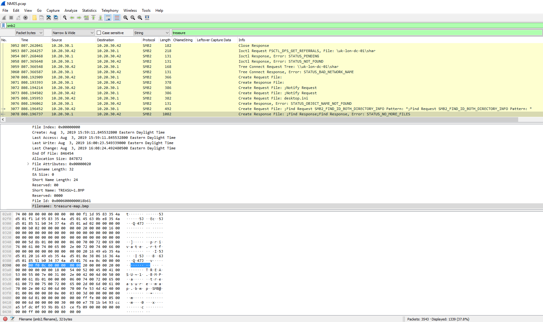 There was also a hint to look at SMB protocols. So immediately upon opening the file, I filtered for this.