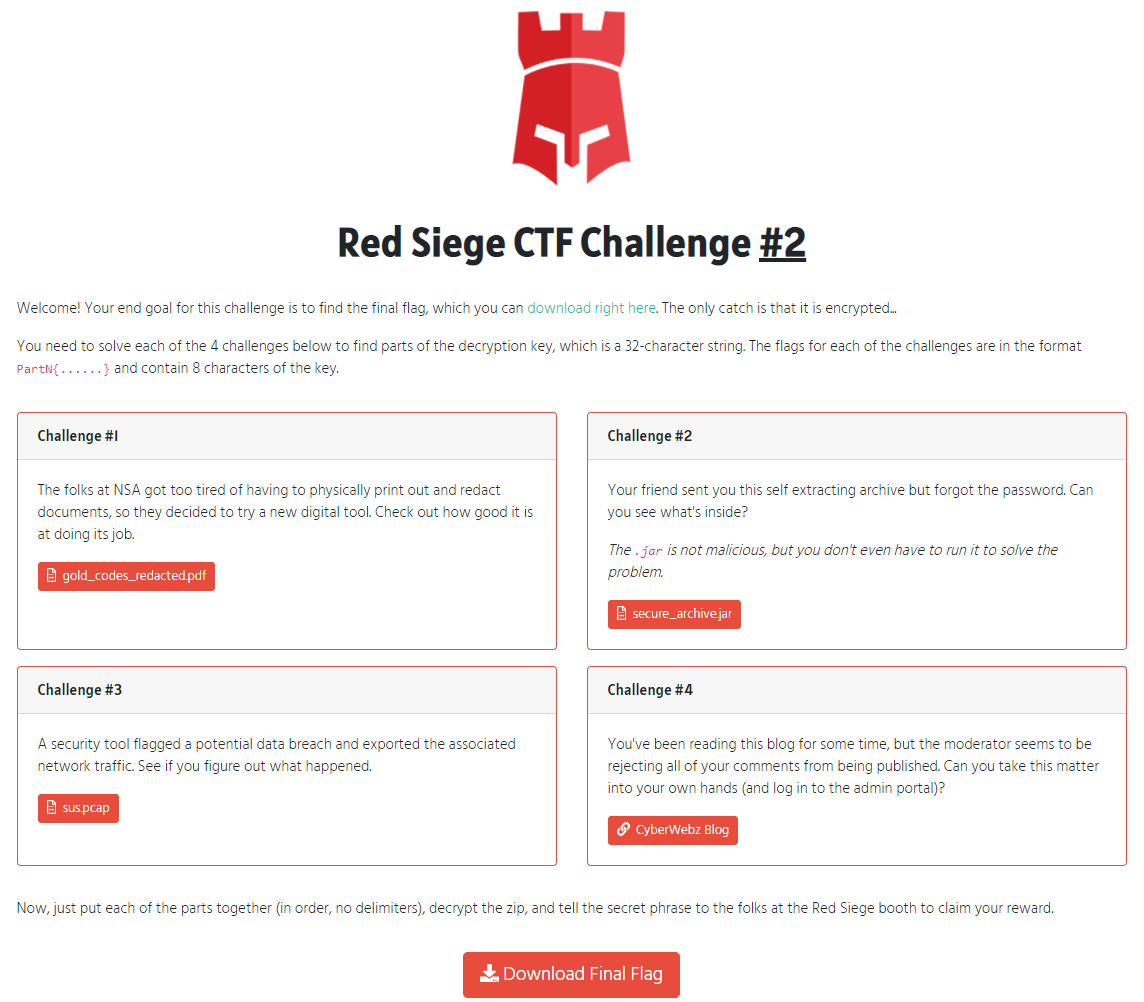 With all of great events to take part in, I decided this year to play in the Red Siege Information Security CTF, which had fewer challenges than the full conference CTF but was still a lot of fun and a great experience all around. The CTF required participants to solve 4 challenges which would lead to a final flag which could then be sent to the Red Siege staff in exchange for a sweet challenge coin (while supplies lasted).
