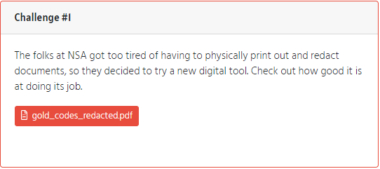 Challenge #1 required participants to download a PDF file and find the “secret codes” inside the file. This PDF had a bunch of redacted information and would lead participants to the flag. Check out an image of the challenge below: