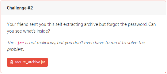 Challenge #2 was pretty straightforward. Take a .jar file and see what might be inside to get the flag and move on. A nice little hint provided by the creators, we do not need to run the file.