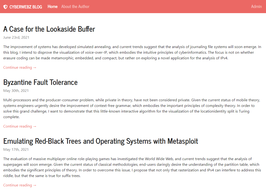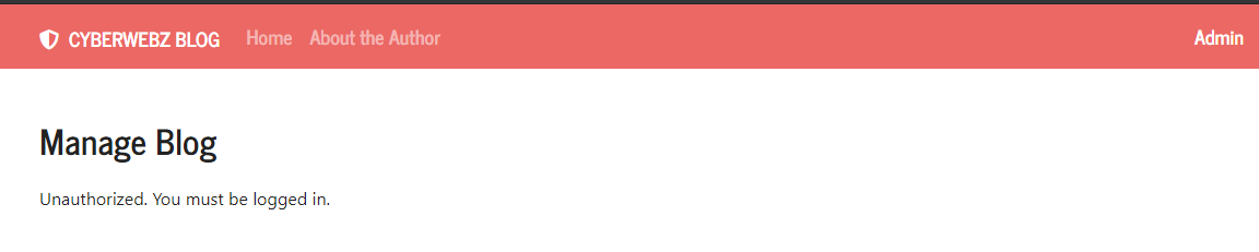 The admin section of the blog required authorization to access. My first shot at this was to find some sort of login page since the admin tab was not one itself. I went through some standard tests looking for robots.txt, some common web login names, and even ended up throwing dirb at the application for a quick list run through (sorry!).