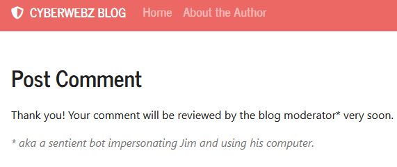 With this in mind and our hint that the bot of Jim is automatically viewing all comments to “approve” them, a new attack path opens up.