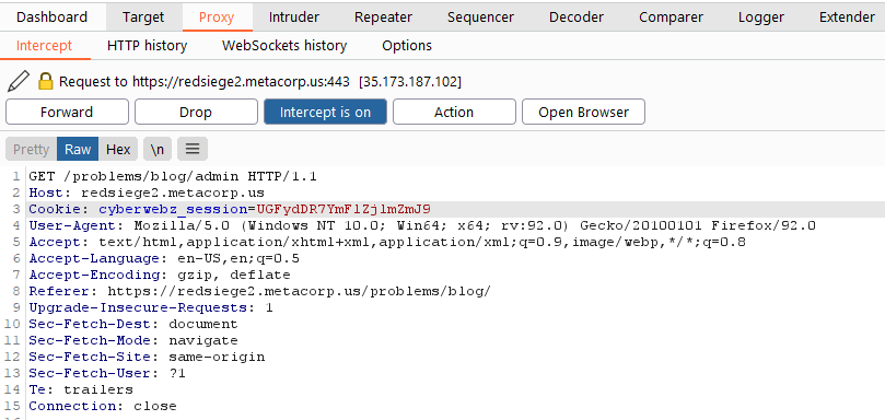 So with successful reflected XSS and knowledge of the page I need to access I fired up Burpsuite to take a closer look at the request/response when visiting the admin page. It turns out there is a cookie being used named “cyberwebz_session”. This is another clue to the puzzle.